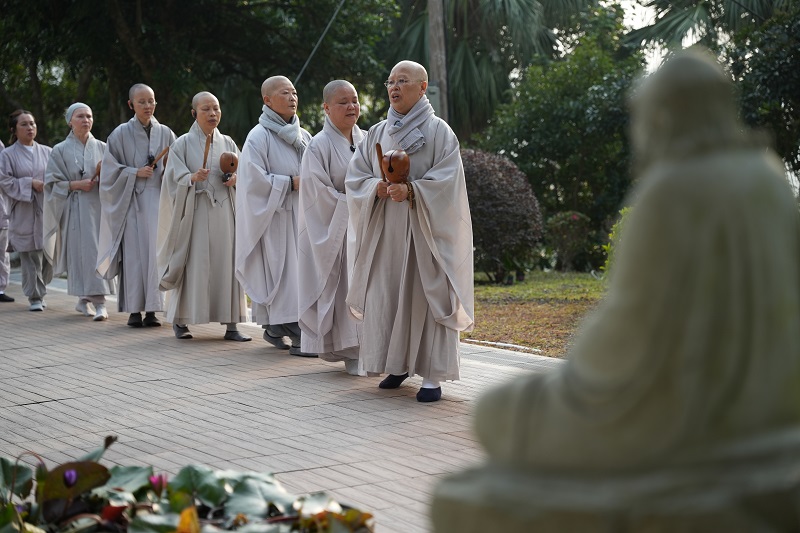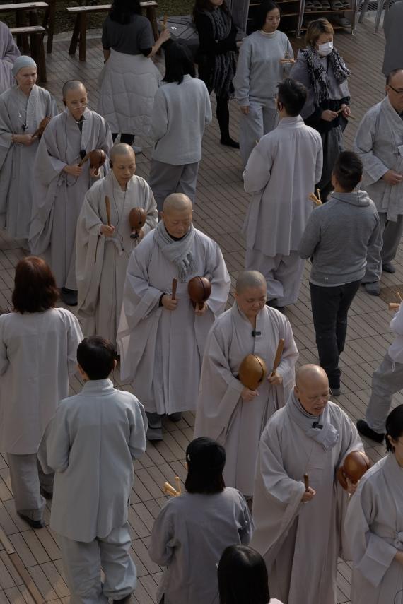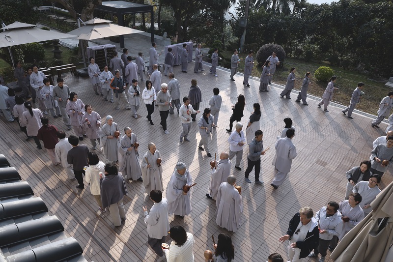 In the afternoon, everyone also hit their hand-held instruments while chanting the sacred name of Avalokiteśvara Bodhisattva, merging one’s own voice, the sounds of the instruments, and the collective chanting into one harmonious whole.